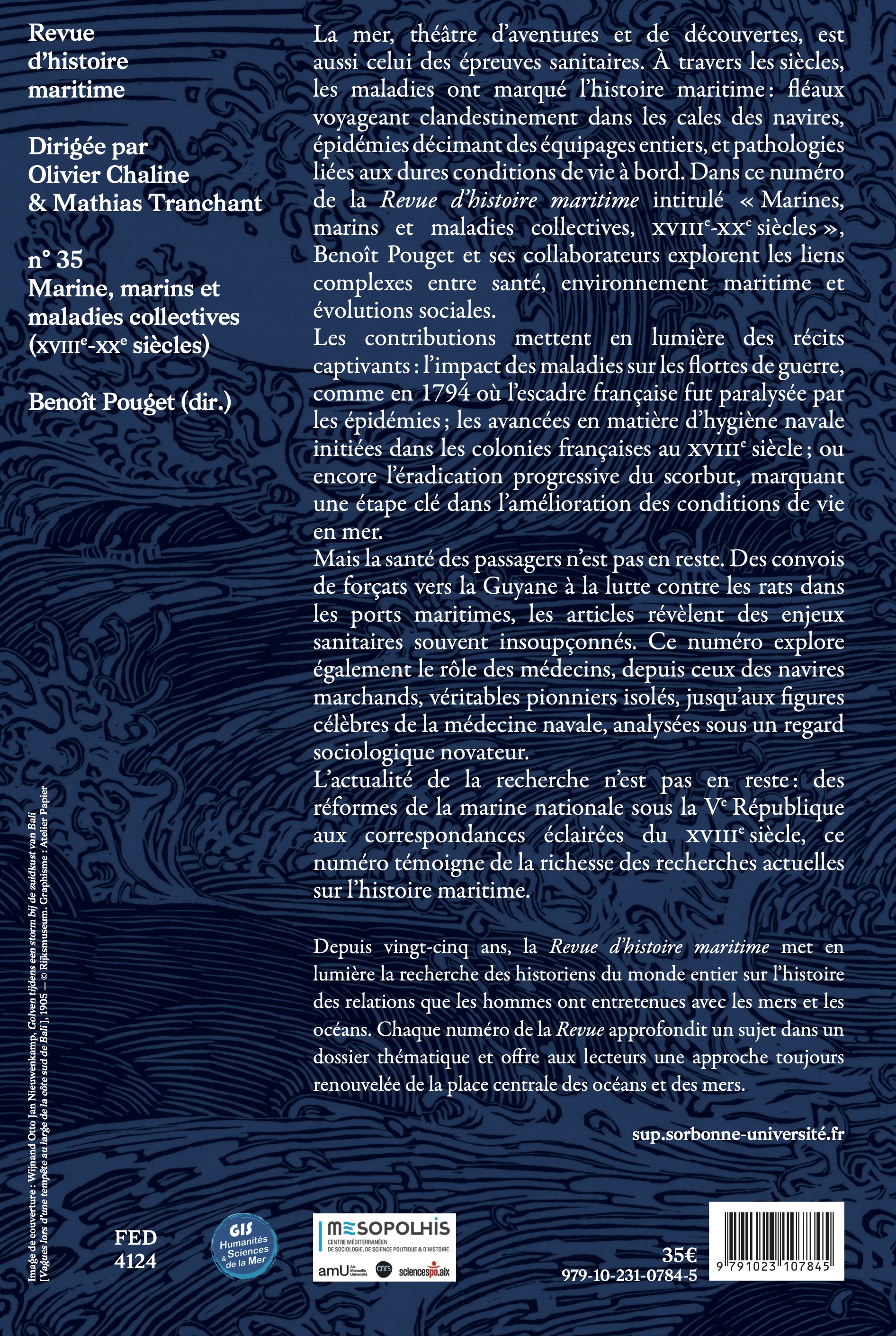 La mer, théâtre d’aventures et de découvertes, est aussi celui des épreuves sanitaires. À travers les siècles, les maladies ont marqué l’histoire maritime : fléaux voyageant clandestinement dans les cales des navires, épidémies décimant des équipages entiers, et pathologies liées aux dures conditions de vie à bord. Dans ce numéro de la Revue d’histoire maritime intitulé « Marines, marins et maladies collectives, XVIIIe – XXe siècle », Benoît Pouget et ses collaborateurs explorent les liens complexes entre santé, environnement maritime et évolutions sociales.